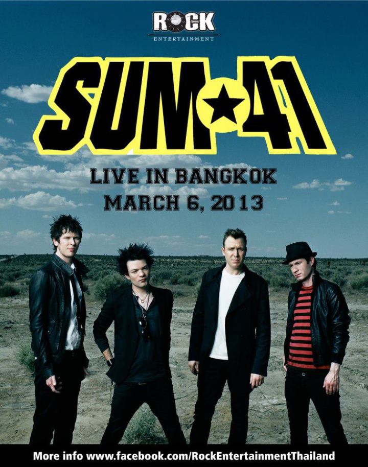 Uncategorized SUM 41 LIVE IN BANGKOK. MARCH 6, 2013 GET YOUR TICKET HERE Share this: Click to share on X (Opens in new window) X Click to share on Facebook (Opens in new window) Facebook Click to share on Tumblr (Opens in new window) Tumblr Click to share on Pinterest (Opens in new window) Pinterest Click to email a link to a friend (Opens in new window) Email Like Loading... Related