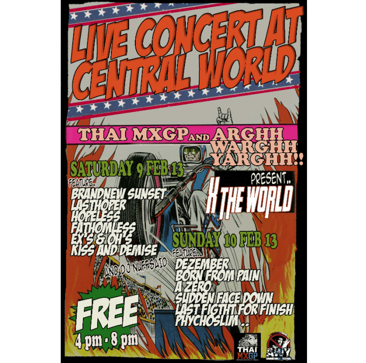 Uncategorized THAI MXGP AND ARGHH WARGHH YARGHH PRESENT…“X THE WORLD” 9-10 FEBRUARY 2013 AT CENTRAL WORLD Share this: Click to share on X (Opens in new window) X Click to share on Facebook (Opens in new window) Facebook Click to share on Tumblr (Opens in new window) Tumblr Click to share on Pinterest (Opens in new window) Pinterest Click to email a link to a friend (Opens in new window) Email Like Loading... Related