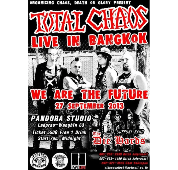 Uncategorized EVENT/CONCERT: TOTAL CHAOS LIVE IN BANGKOK 27 SEPTEMBER 2013 Share this: Click to share on X (Opens in new window) X Click to share on Facebook (Opens in new window) Facebook Click to share on Tumblr (Opens in new window) Tumblr Click to share on Pinterest (Opens in new window) Pinterest Click to email a link to a friend (Opens in new window) Email Like Loading... Related