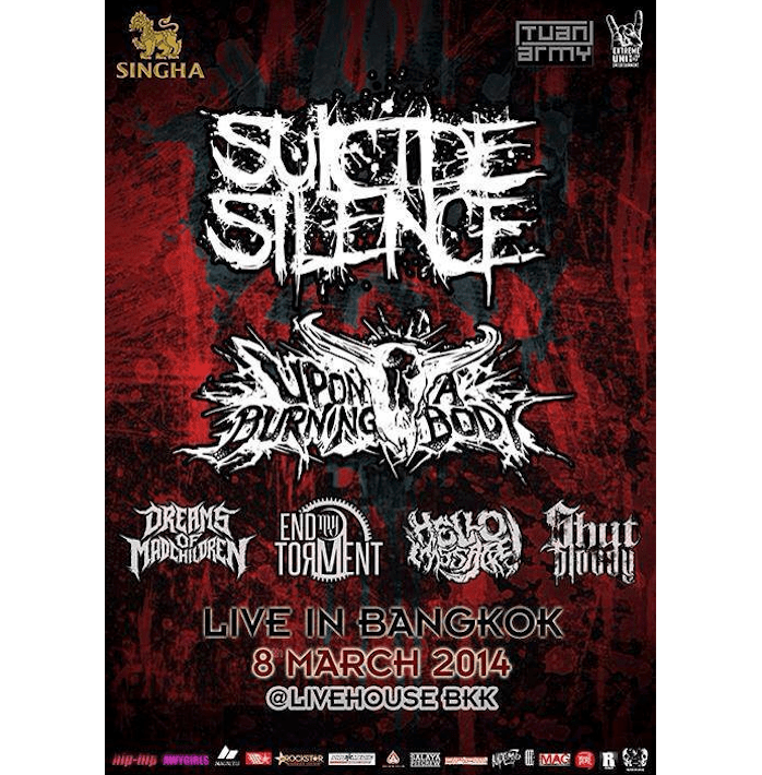 EVENT/CONCERT: Suicide Silence x Upon a Burning Body Live in Bangkok 8 March 2014 @ LIVE HOUSE BKK Get info here: https://www.facebook.com/events/1403536519896031/?refid=13 Continue reading Suicide Silence x Upon a Burning Body Live in Bangkok
