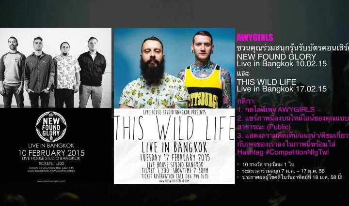 We are giving away free tickets for the “New Found Glory Live in Bangkok 2015” and “This Wild Life Live in Bangkok 2015” These concerts are going down on February 2015, which is why we’re hooking 5 lucky AWYGIRLS readers up … Continue reading COMPETITION: ENTER TO WIN FREE CONCERT TICKETS